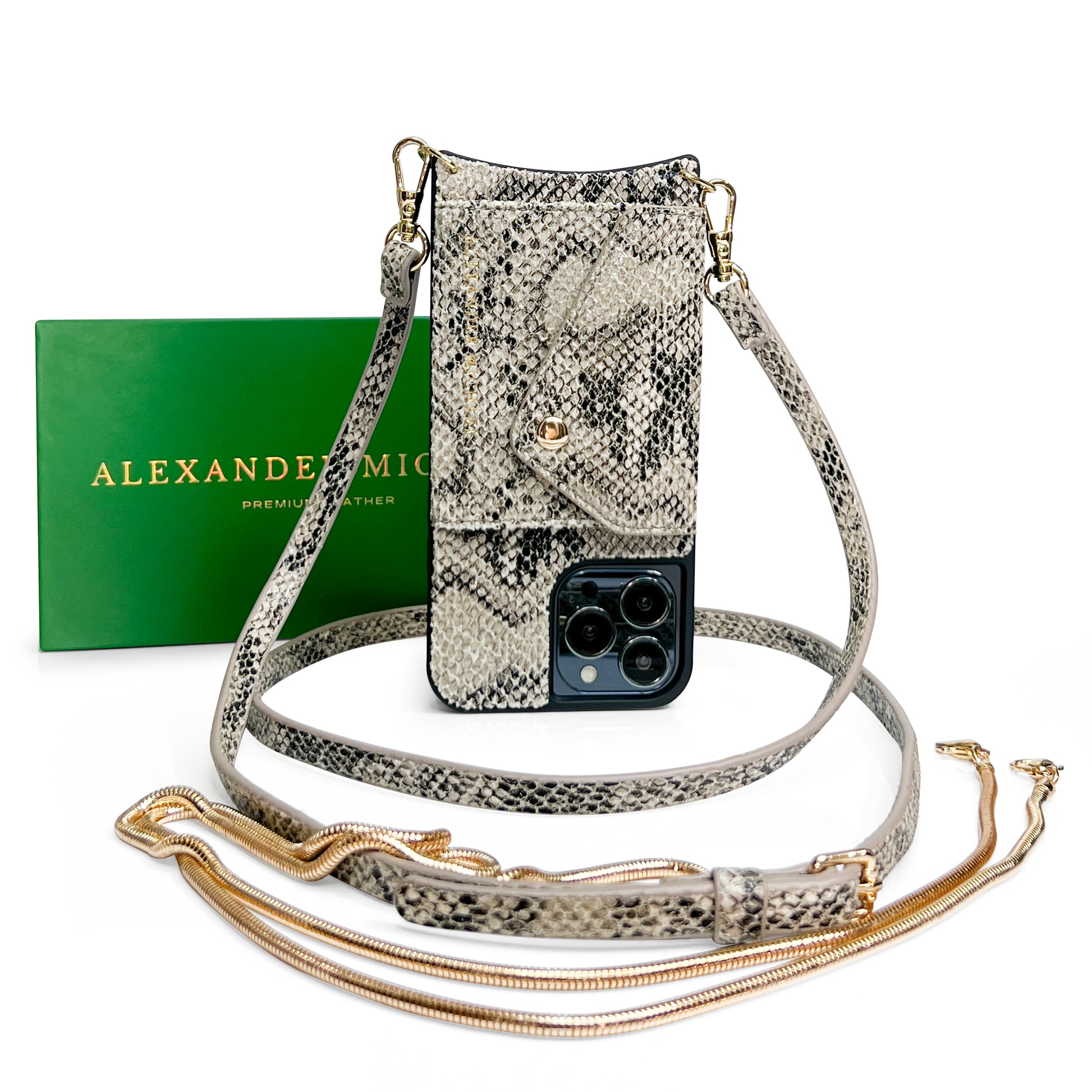 Alexander Michael Caviar Collection is made from 100% Premium Quality Leather. It features an envelope-style wallet, safely keeping your cards accessible. It features two types of straps -A thin leather strap and a gold chain strap, which converts your phone wallet to the crossbody of your choice. Having two straps is always better than one and this set gives you the versatility and freedom to choose your style.